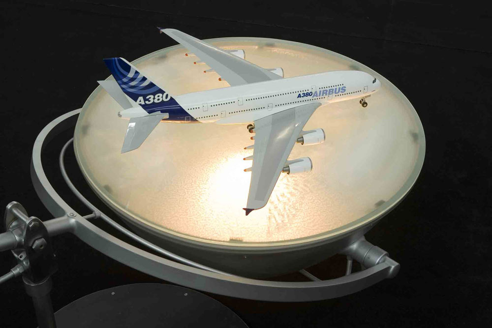 Réplica de Avião A 380, vidro, metal, sistema eléctrico, miniaturas humanas em PVC (88×102x170cm) Fotografia: Cortesia do artista